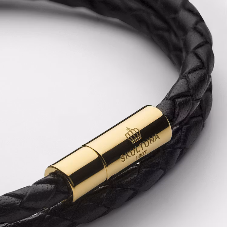 Flätat armband i svart och guld som viras två varv runt handleden.