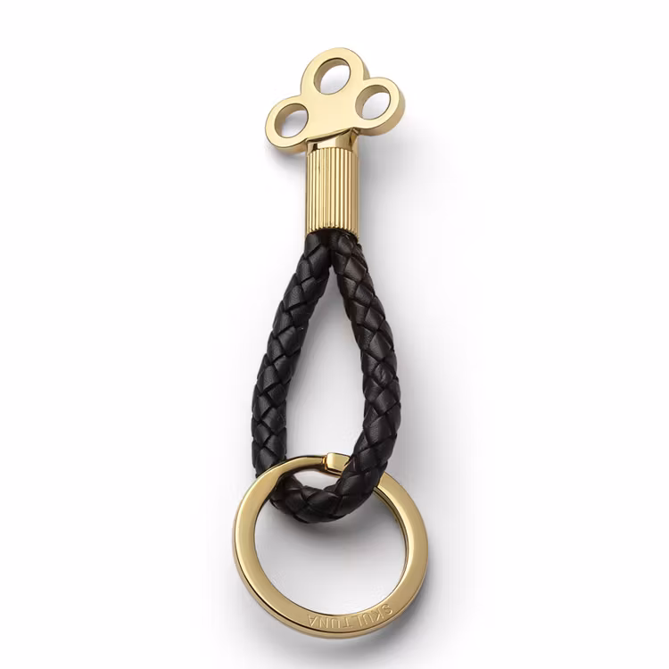 Stilren nyckelring i svart läder och guldpläterat stål.