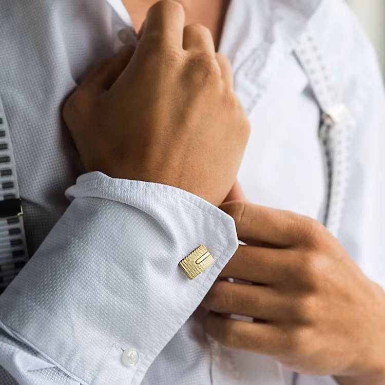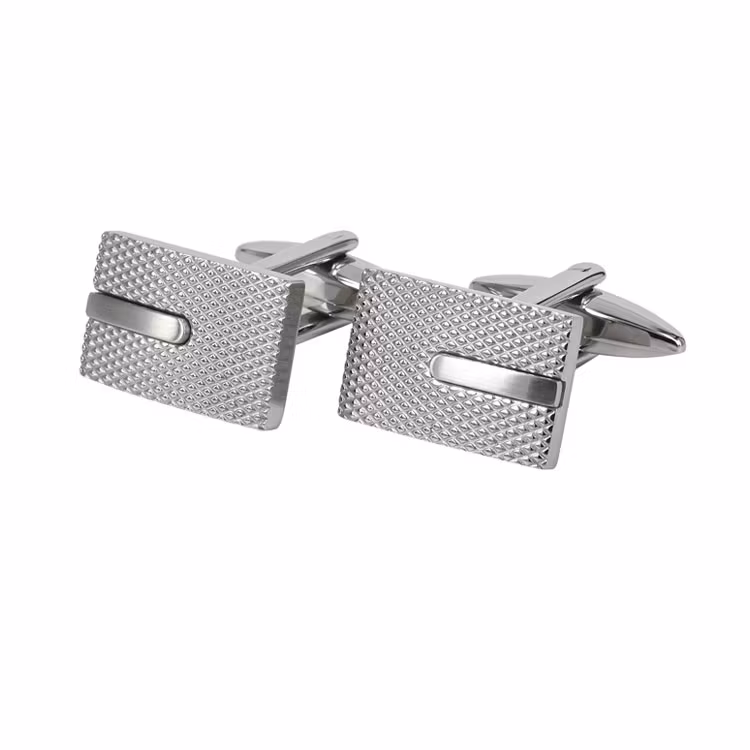 Rektangulära manschetter i stål med en matt mönstrad yta.