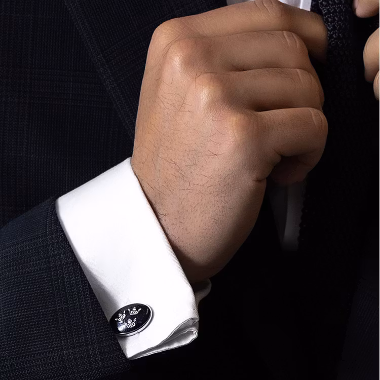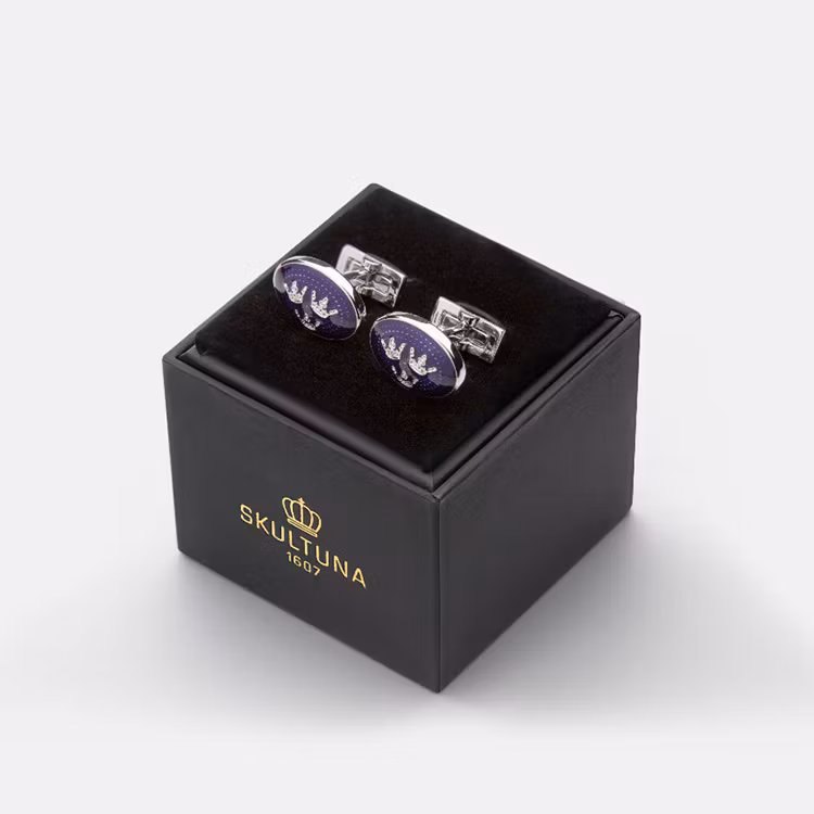 Manschettknappar med Sveriges lilla riksvapen med de tre kronorna på en blå bakgrund.