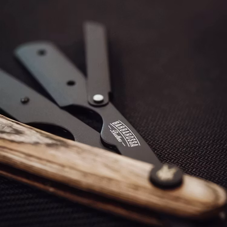 Barbarossa Brothers The Buccaneer Wooden är en rakbladskniv som har en kombination av stilen på en klassisk rakkniv men med enkelheten av ett utbytbart blad. En kniv som ger dig en supernära rakning utan något underhåll.