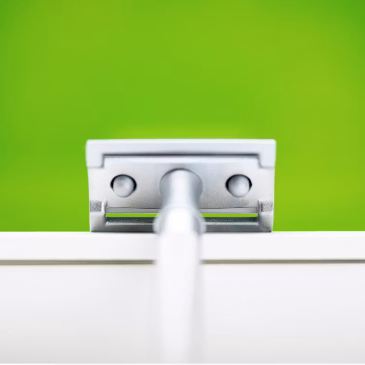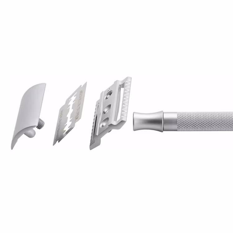 Klassisk säkerhetshyvel med matt kromad yta och långt handtag.