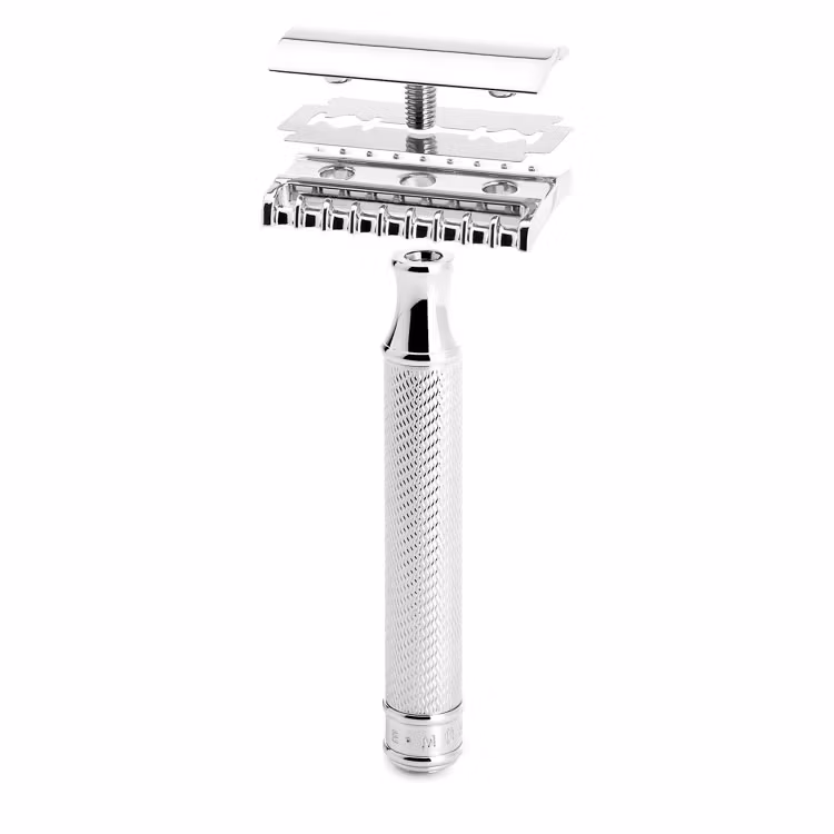 Omtyckt säkerhetshyvel med öppen kam för en mer aggressiv rakning.