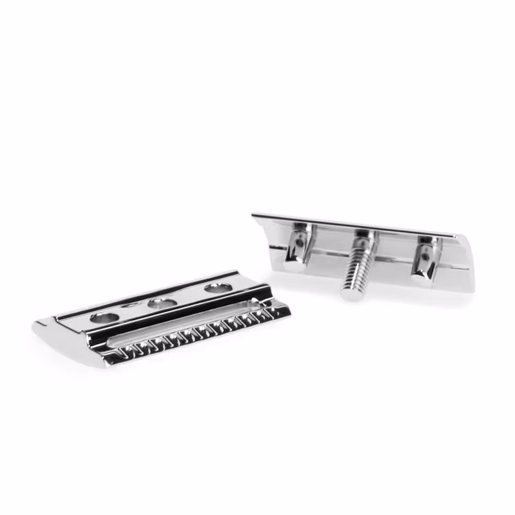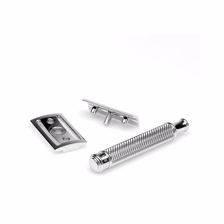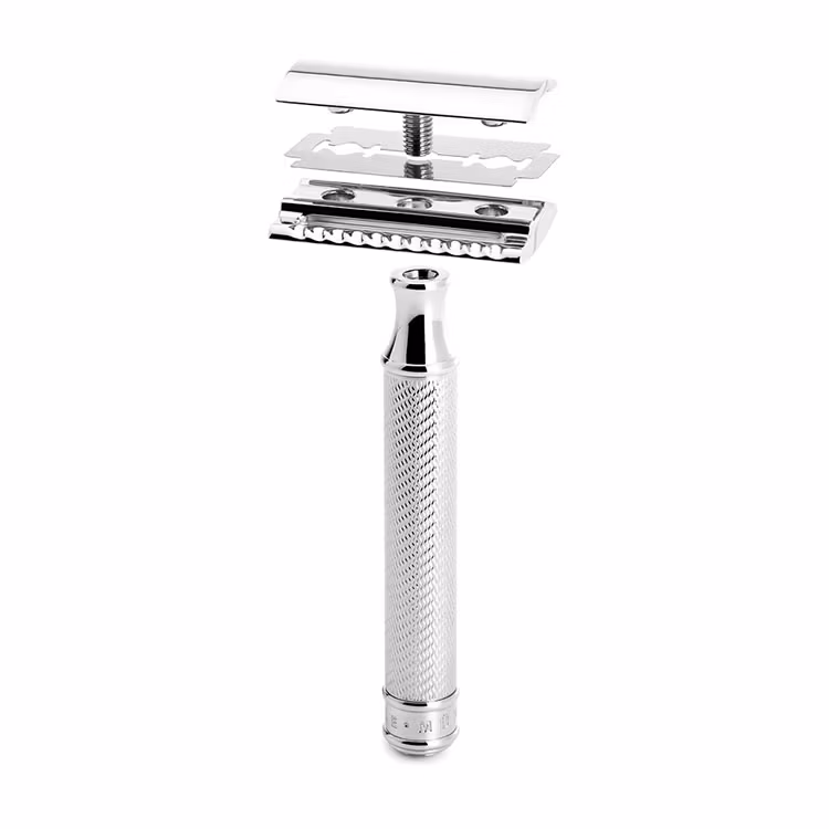 Omtyckt säkerhetshyvel i klassisk modell som ger en medelaggressiv rakning.