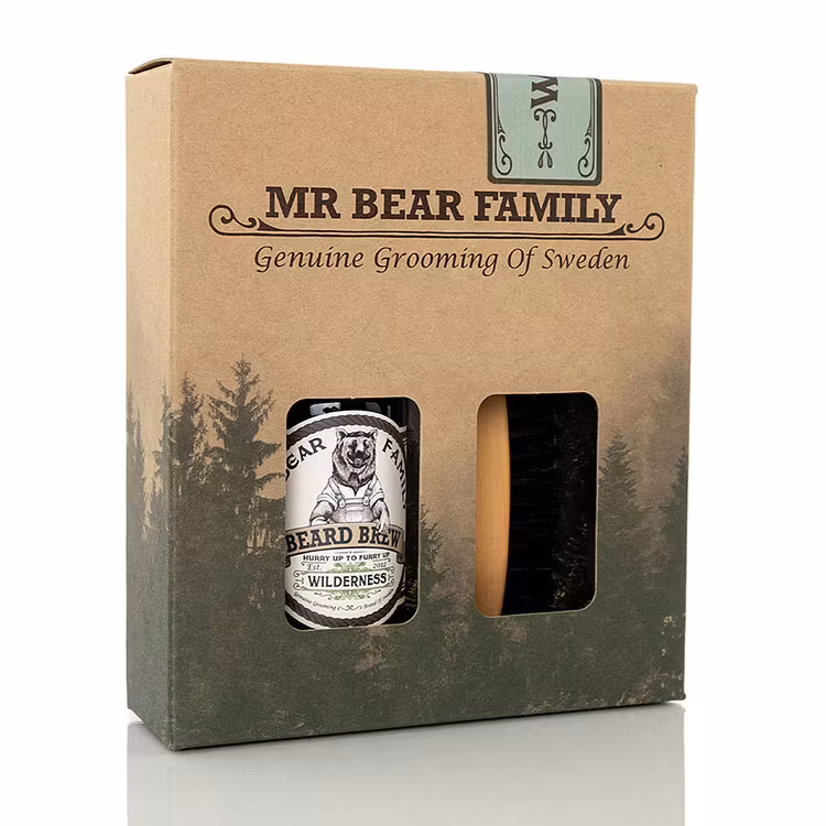 Mr Bear Family Brew & Brush Kit Wilderness är ett skäggkit som består av en skäggolja och en skäggborste i praktisk resestorlek. Oljan återfuktar skägget och lugnar huden. Borsten är inte bara väldigt bra när du ska fördela oljan i skägget – att regelbundet borsta skägget kan göra underverk för huden. Vildsvinsborsten kan även lyfta bort damm och smuts ur skägget.
