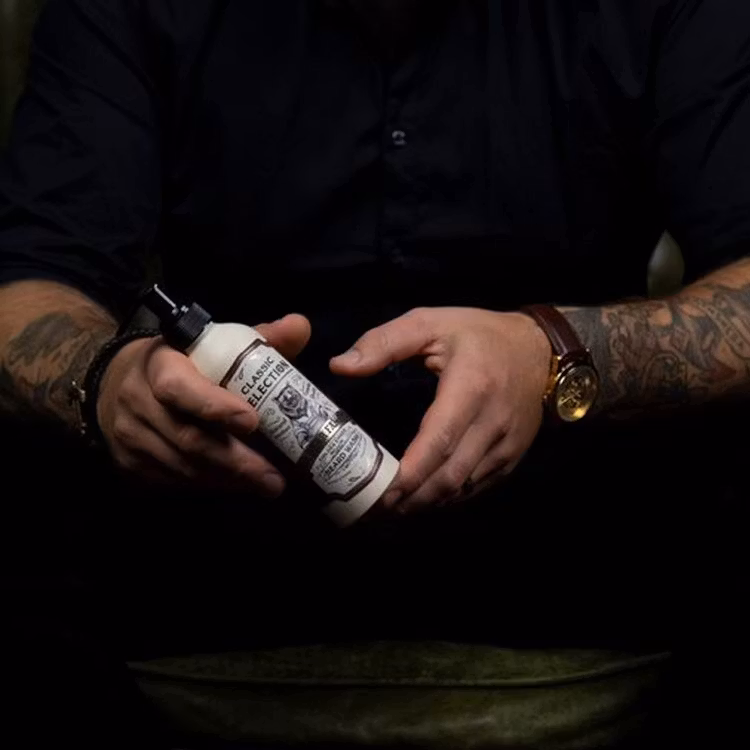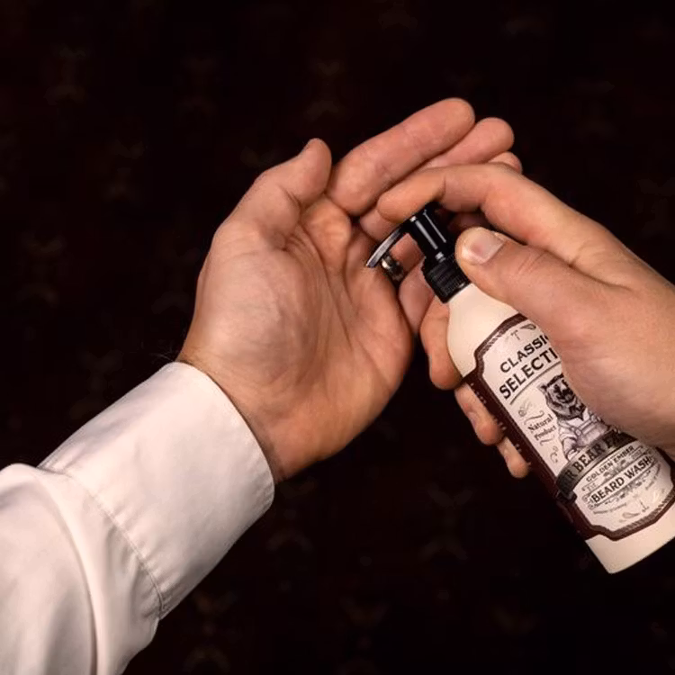 Pumpa ut en lagom mängd tvål i handflatan och massera in i fuktigt skägg. Skölj ur med varmt vatten.