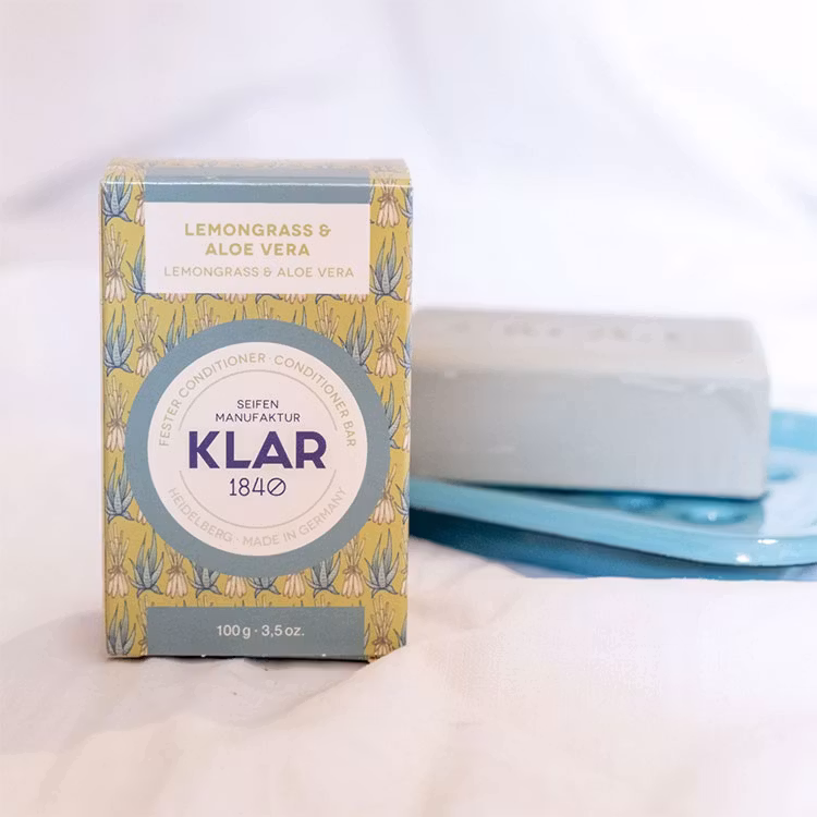 Klar Seifen Lemongrass & Aloe Vera Conditioner Bar är ett fast hårbalsam med citrongräs och aloe vera - för dig som har fett hår. Balsamet tynger inte ner håret utan lämnar det fräscht och mjukt. Aloe vera har en återfuktande effekt medan citrongräset avfettar håret. 100 % veganskt och gjort på ingredienser från växtriket.