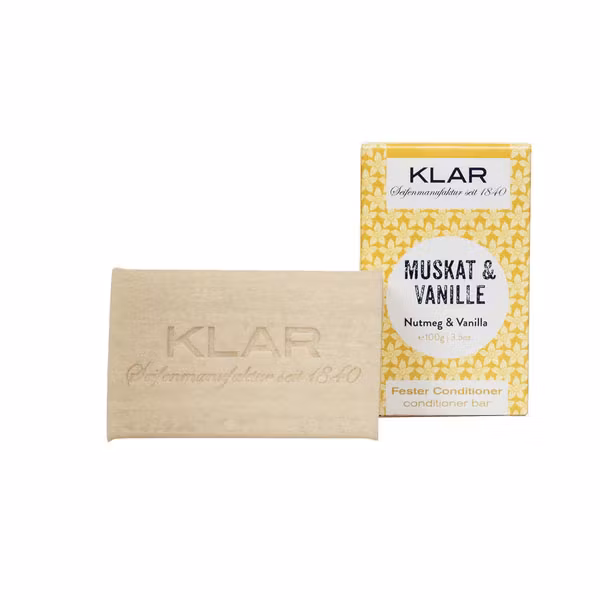 Klar Seifen Nutmeg & Vanilla Conditioner Bar är ett hårbalsam i fast form för normalt hår. Ger håret näring och gör det silkesmjukt efter schamponering. Den söta och kryddiga doften av vanilj och muskot skämmer bort sinnena och gör att håret doftar underbart. Balsamet säkerställer bättre kambarhet och hjälper till att behålla hårets smidiga struktur.