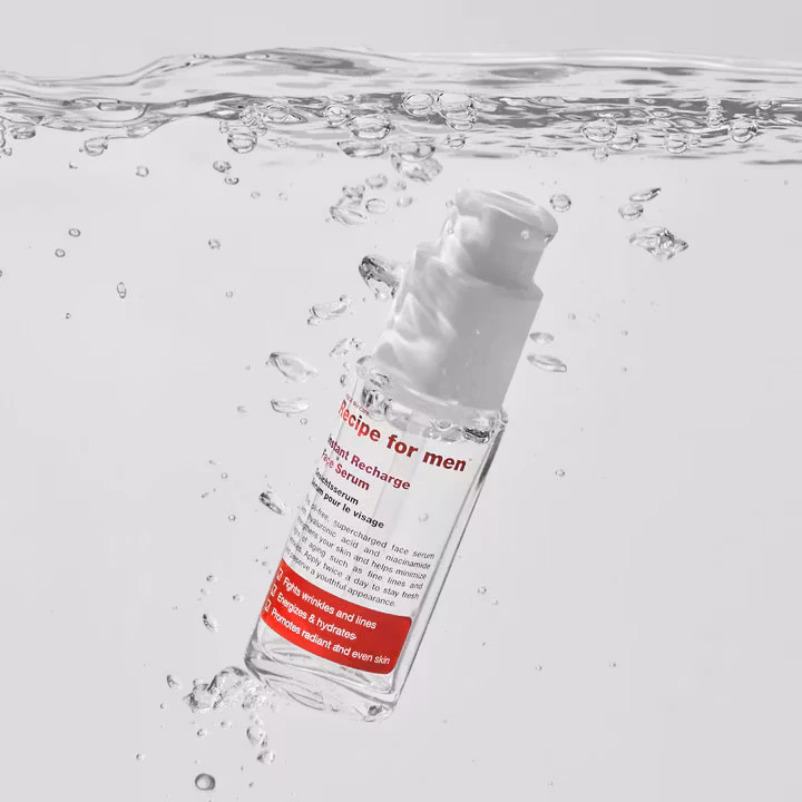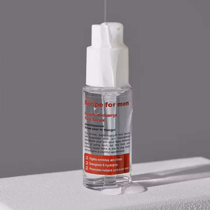 Recipe for men Instant Recharge Face Serum är speciellt utvecklat för manlig hud och erbjuder mångsidiga fördelar i ett enda serum. Det verkar anti-aging, tillför och binder fukt samt ger en utjämnande effekt. Med en lätt, oljefri konsistens absorberas serumet snabbt utan kladd, och det har en mild parfymering.